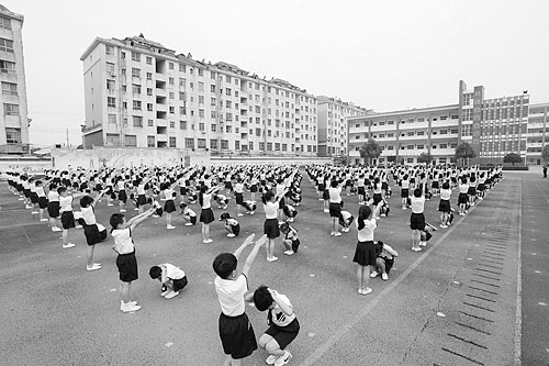 學(xué)生們展示消防安全疏散操